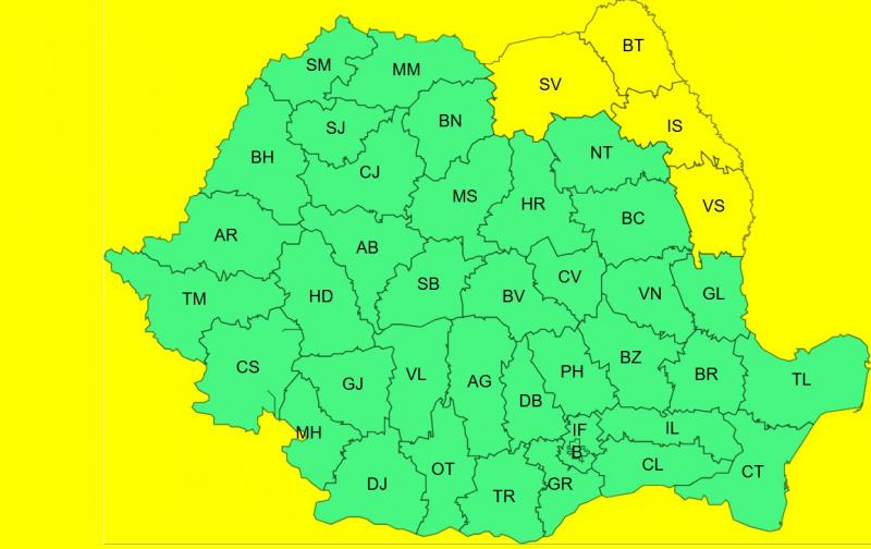 Totodată, intră în vigoare un cod galben de ger, valabil în intervalul 15 ianuarie, ora 20:00 şi până vineri, 16 ianuarie, ora 20:00. Fenomenele vizate sunt temperaturi deosebit de scăzute și local ger. Zonele afectate sunt nordul și estul Moldovei.
