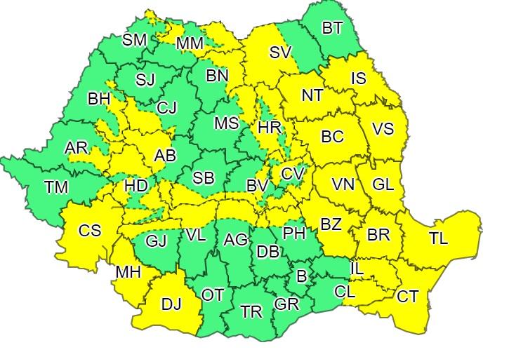 Judeţele marcate cu cod galben sunt Alba, Argeş, Arad, Bacău, Bihor, Bistriţa-Năsăud, Brăila, Braşov, Buzău, Cluj, Călăraşi, Caraş-Severin, Constanţa, Covasna, Dâmboviţa, Dolj, Gorj, Galaţi, Hunedoara, Harghita, Ialomiţa, Iaşi, Mehedinţi, Maramureş, Mureş, Neamţ, Prahova, Sibiu, Satu Mare, Suceava, Tulcea, Timiş, Vâlcea, Vrancea şi Vaslui.