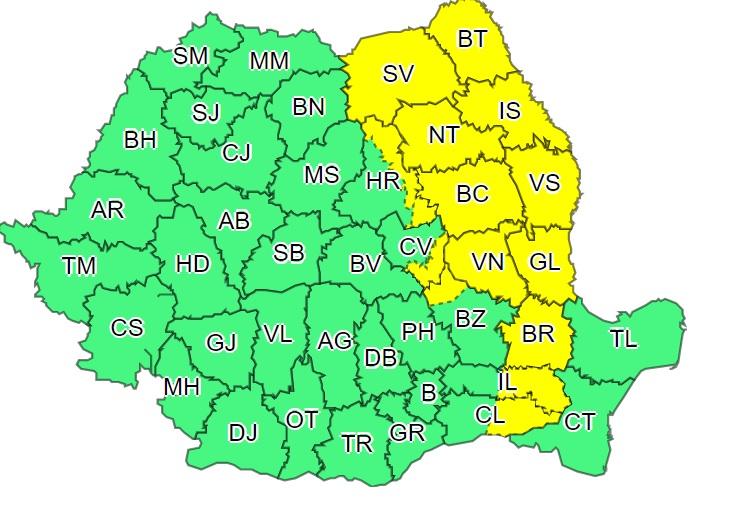 Județele sub cod galben sunt Suceava, Neamț, Harghita, Covasna, Botoșani, Iași, Bacău, Vaslui, Vrancea, Galați, Buzău, Brăila, Ialomița și Călărași.