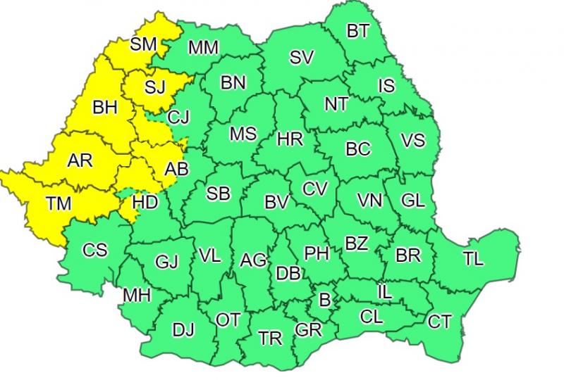 Potrivit ANM, sunt vizate județele Satu Mare, Sălaj, Bihor, Cluj, Alba, Hunedoara, Arad și Timiș.