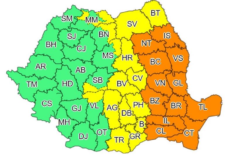 Harta județelor afectate de codurile galben și portocaliu