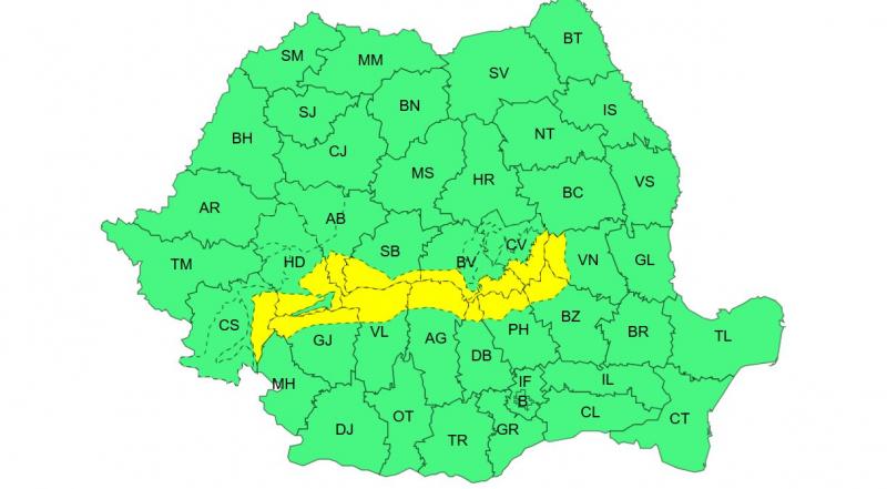 Ulterior, de luni de la ora 21.00 și până marți la ora 10.00 este cod galben de vânt în Carpații Meridionali și în Carpații de Curbură. Aici, vântul va avea intensificări cu viteze de 70…80 km/h, iar la altitudini de peste 1700 m vor fi rafale de 90…100 km/h.