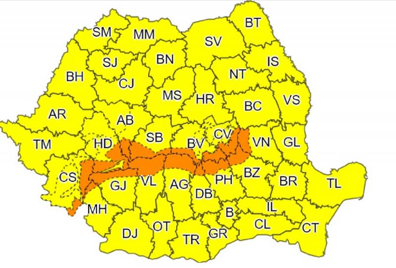 Codul portocaliu vizează zona montană a județelor Caraș Severin, Mehedinți, Hunedoara, Gorj, Vâlcea, Alba, Sibiu, Brașov, Argeș, Dâmbovița, Prahova, Covasna, Buzău și Vrancea.