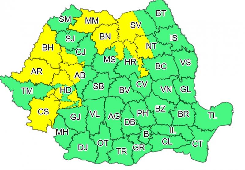 Codul galben vizează județele Bihor, Cluj, Alba, Hunedoara, Arad, Timiș, Caraș-Severin, Maramureș, Bistrița-Năsăud, Mureș, Harghita, Neamț și Suceava.