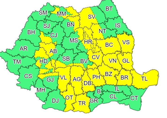 Codul galben vizează județele Maramureș, Suceava, Bistrița-Năsăud, Neamț, Harghita, Mureș, Brașov, Covasna, Prahova, Dâmbovița, Argeș, Vâlcea, Gorj, Sibiu, Alba, Cluj, Hunedoara, Bacău, Vaslui, Vrancea, Galați, Buzău, Brăila, Tulcea, Teleorman și Olt.