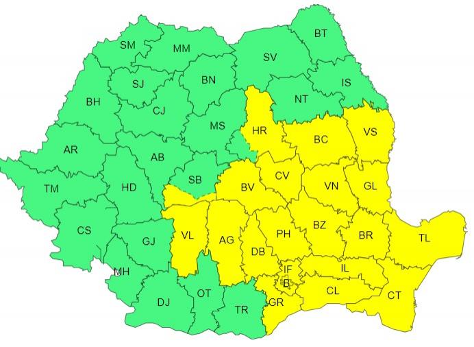 Sunt sub cod galben județele: Harghita, Covasna, Brașov, Sibiu, Vâlcea, Argeș, Dâmbovița, Giurgiu, Ilfov, Prahova, Călărași, Ialomița, Constanța, Tulcea, Buzău, Brăila, Galați, Vrancea, Bacău, Vaslui și Bucureștiul.