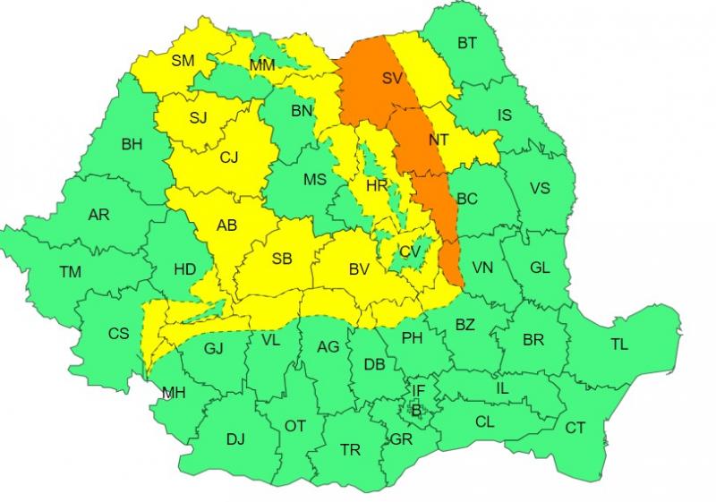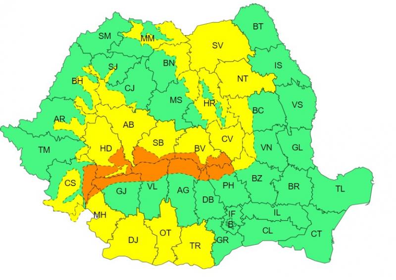 De asemenea, un cod galben valabil între orele 10 și 22, vântul va avea intensificări în sudul Transilvaniei, vestul și sudul Olteniei, sud-vestul Munteniei și în nord-vestul Moldovei, cu viteze în general de 55...65 km/h, iar la munte, rafalele vor depăși 80…90 km/h.
