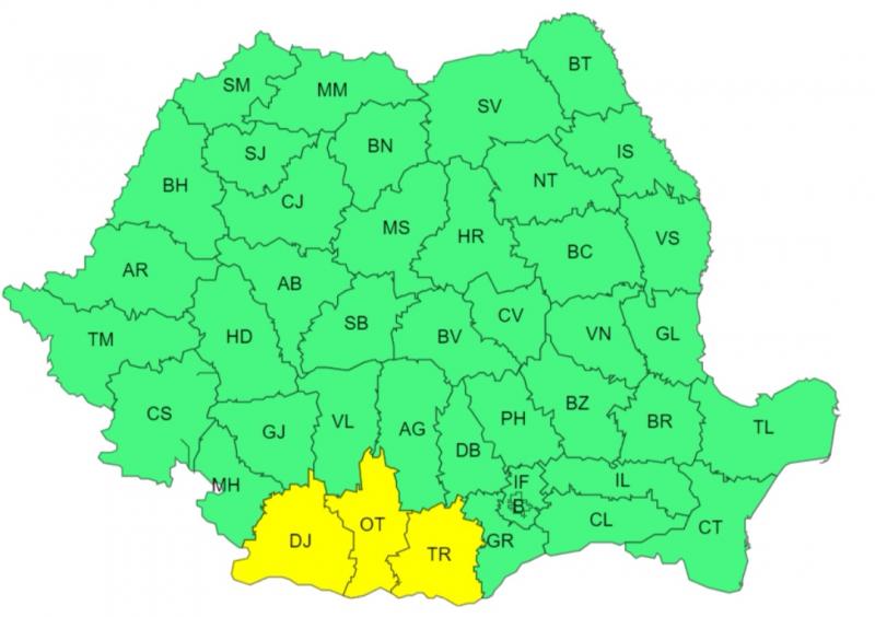 În sudul Olteniei și sud-vestul Munteniei vor fi precipitații predominant sub formă de ploaie. Local se vor acumula cantități de apă de 20...25 l/mp și izolat de 30...40 l/mp. Potrivit ANM, în restul Olteniei și al Munteniei, precum și în Dobrogea vor fi precipitații predominant sub formă de ploaie, iar cantitățile de apă vor fi izolat de 10...15 l/mp. Vor fi condiții de polei.
