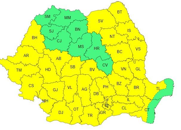 O alteră cod galben vizează, luni, Crișana, Banatul, sudul Transilvaniei, Oltenia, Muntenia, Dobrogea continentală și Moldova. Se vor înregistra temperaturi deosebit de ridicate pentru această dată, va fi caniculă și disconfort termic ridicat, iar indicele temperatură-umezeală (ITU) va depăși ușor pragul critic de 80 de unități. Temperaturile maxime vor fi în general de 35...37 de grade, pe arii restrânse mai ridicate în sud și în est.