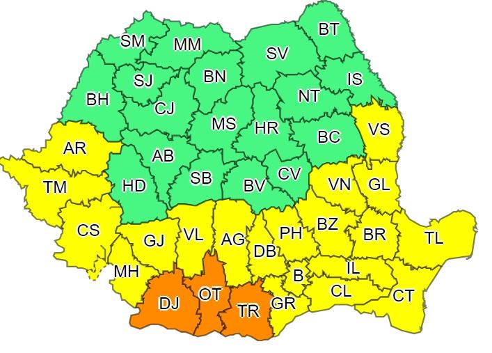 Însă avem şi cod portocaliu de caniculă, pentru județele Dolj, Olt și Teleorman. Aici se vor înregistra temperaturi maxime de 38...39 de grade, disconfortul termic va fi accentuat, iar indicele temperatură-umezeală (ITU) va depăși pragul critic de 80 de unități. Temperaturile minime se vor situa în general peste 20...22 de grade.