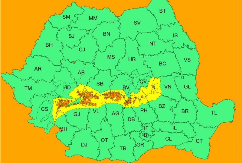 Totodată, intră în vigoare o atenționare meteorologică de cod galben, valabil de marți, 24 februarie ora 10 și până seara, la ora 20. Fenomenele vizate sunt viscol şi strat de zãpadã, iar regiunile afectate sunt Carpaţii Meridionali, Carpaţii de Curburã şi local Carpaţii Occidentali.
