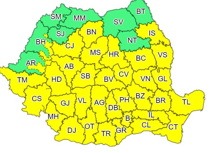 Administrația Națională de Meteorologie a extins avertizarea cod galben de ploi torențiale, grindină și vijelii în aproape toată țara, mai precis 34 de județe și București. Alerta de vreme severă este valabilă de astăzi, de la ora 12.00, până la noapte, și vizează zone din Banat, Oltenia, Muntenia, Dobrogea, Transilvania, centrul și sudul Moldovei.