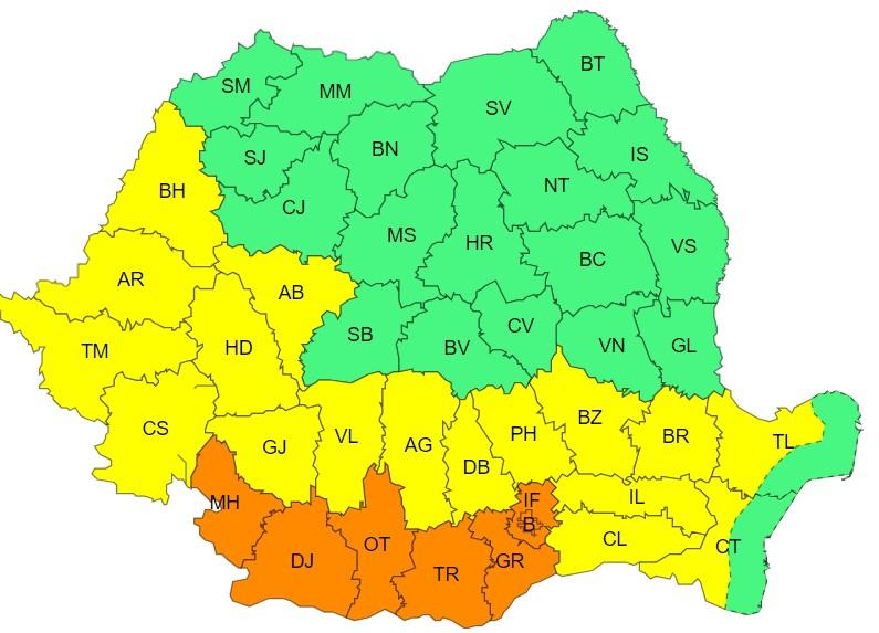 Zone afectate: județele Mehedinți, Dolj, Olt, Teleorman, Giurgiu, Ilfov și municipiul București