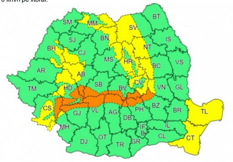 Administraţia Naţională de Meteorologie (ANM) a emis o avertizare Cod galben privind intensificări ale vântului, viscol, ninsori însemnate cantitativ, valabilă de marţi, de la ora 10.00, până miercuri, la ora 8.00, în zona de munte a judeţelor Maramureş, Bistriţa-Năsăud, Suceava, Neamţ, Bacău, Vrancea, Covasna, Harghita, Mureş, Cluj, Bihor, Alba, Hunedoara, Caraş-Severin şi Mehedinţi.