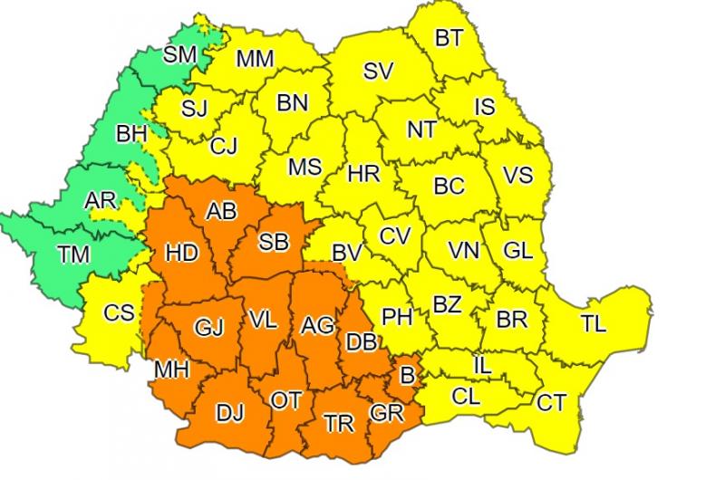 În Oltenia, vestul și nord-vestul Munteniei, sud-vestul Transilvaniei și local în Carpații Meridionali, instabilitatea atmosferică va fi accentuată, iar în intervale scurte de timp, dar mai ales prin acumulare, se vor înregistra cantități de apă de 50...90 l/mp. Mai ales după-amiaza și seara, cu precădere în jumătatea sudică a Olteniei și în sud-vestul și centrul Munteniei vor fi perioade în care se vor semnala și vijelii puternice (viteze de 75...90 km/h), grindină și frecvente descărcări electrice.