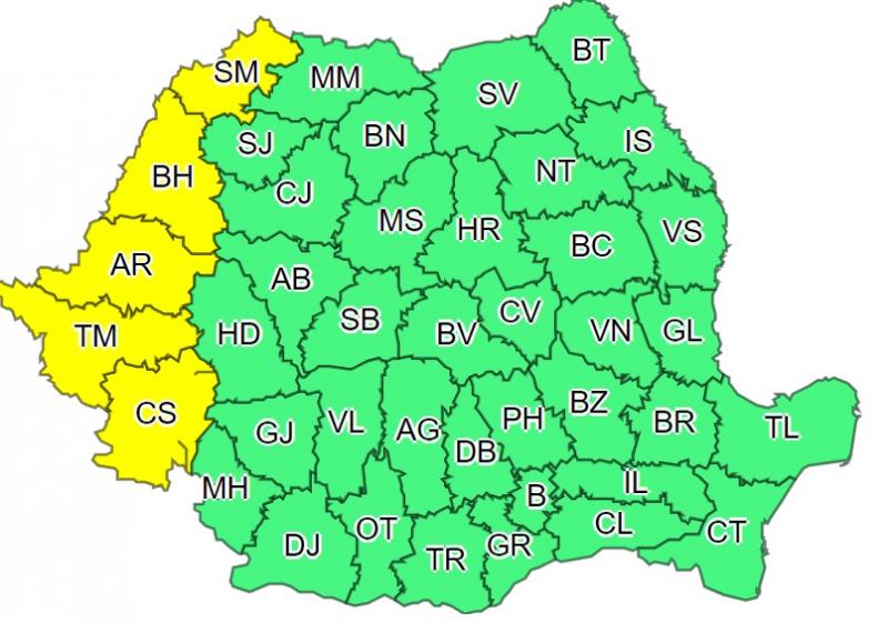 Alerta este valabilă în județele Satu Mare, Bihor, Arad, Timiș și Caraș Severin.