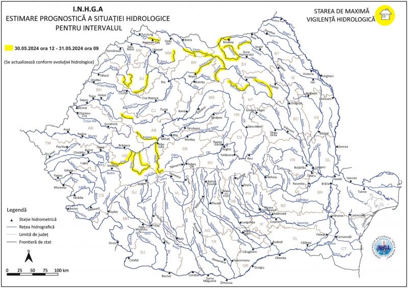 În intervalul 30.05.2024 ora 12:00 – 31.05.2024 ora 09:00 pe râurile din bazinele hidrografice: Vişeu – bazin superior şi afluenţi bazin mijlociu şi inferior, Iza – bazin superior şi afluenţi bazin mijlociu şi inferior, Tur – bazin superior şi afluenţi bazin mijlociu şi inferior, Lăpuş – bazin superior şi afluenţi bazin mijlociu şi inferior (judeţul Maramureş), Someşul Mare – bazin amonte S.H. Nepos (judeţul Bistriţa Năsăud), Someş – afluenţii mici aferenţi sectorului aval S.H. Dej (judeţele: Cluj, Salaj, Maramureş şi Satu Mare), Crasna – bazin superior şi afluenţi bazin mijlociu şi inferior (judeţele: Sălaj şi Satu Mare), Barcău – bazin superior şi afluenţi bazin mijlociu şi inferior (judeţele: Sălaj şi Bihor), Arieş – bazin superior şi afluenţi bazin mijlociu şi inferior (judeţele: Alba şi Cluj), Mureş – afluenții aferenți sectorului aval confluență cu râul Târnava – amonte S.H. Brănişca (judeţele: Alba, Sibiu şi Hunedoara), Bistriţa – bazin superior şi afluenţi bazin mijlociu şi inferior (judeţele: Suceava, Harghita, Neamţ şi Bacău), Moldova – bazin superior şi afluenţi bazin mijlociu şi inferior (judeţele: Suceava şi Neamţ), Suceava – bazin superior (judeţul Suceava).