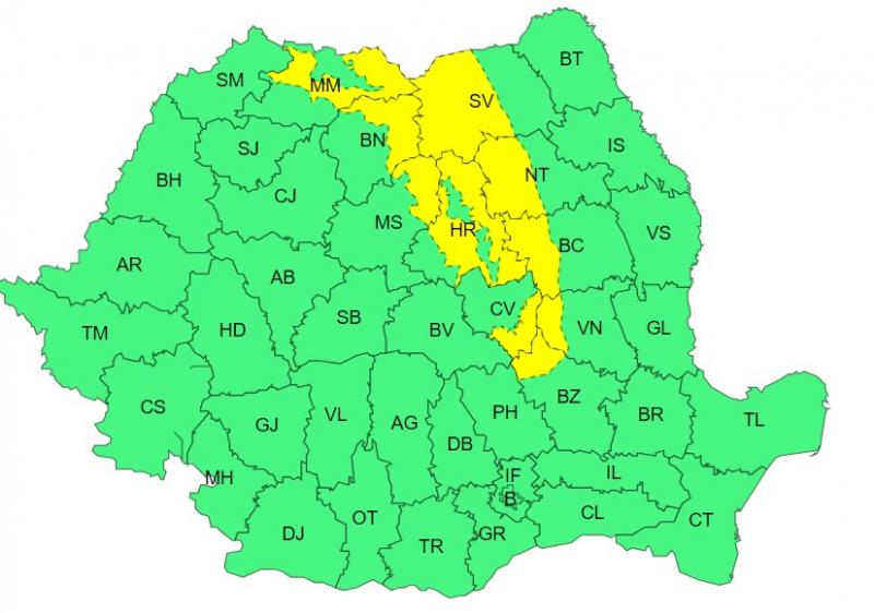 Potrivit ANM, sunt vizate județele Maramureș, Bistrița-Năsăud, Mureș, Harghita, Covasna, Băzău, Vrancea, Bacău, Neamț și Suceava.
