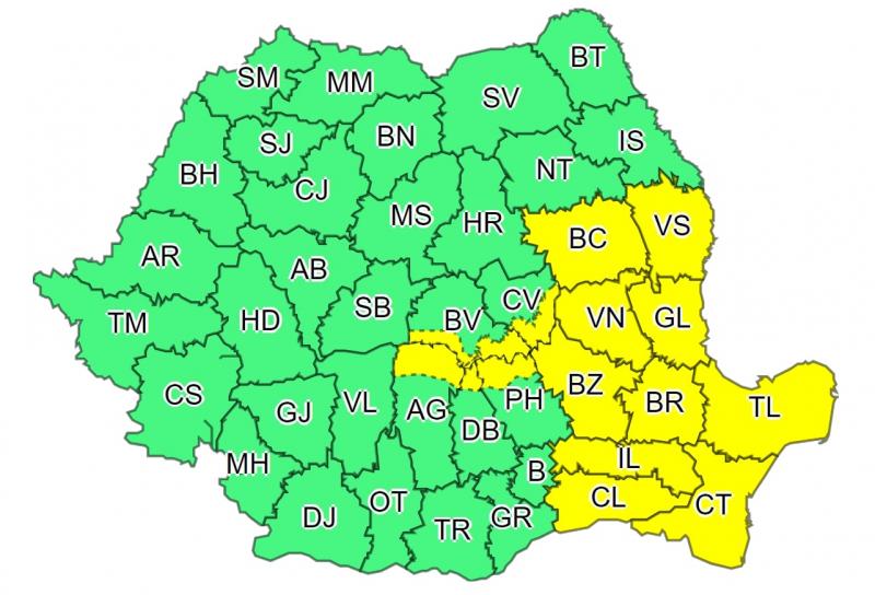 Cod Galben de vânt şi ploi abundente în partea de sud-est a ţării. Harta judeţelor vizate