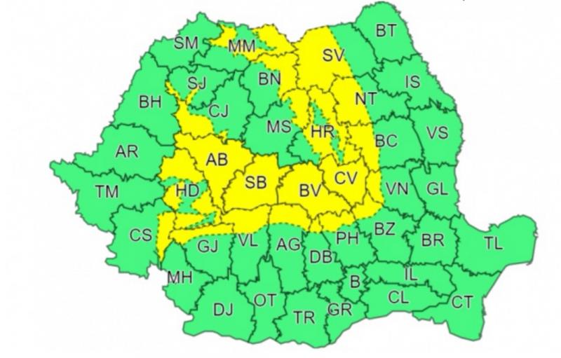 Administrația Națională de Meteorologie a emis două Coduri galbene de vânt și viscol la munte. Unul e valabil până luni în nouă județe, cel de-al doilea până marți în 22 de județe.