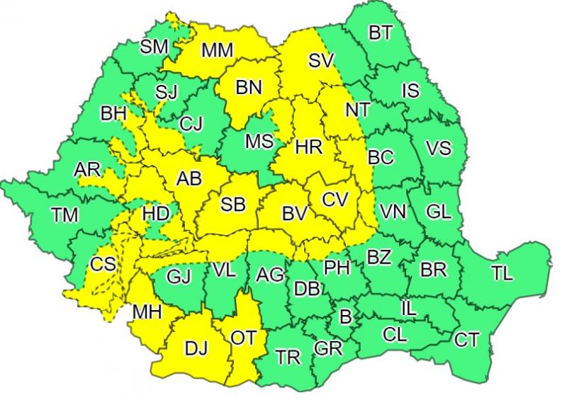 Harta județelor afectate de codul galben