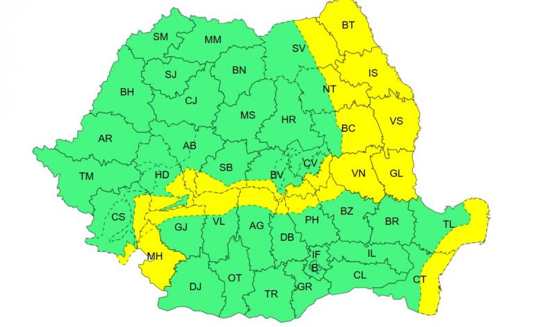Prima avertizare Cod galben este valabilă în intervalul vineri, ora 14 - sâmbătă, ora 16. Temporar, vântul va avea intensificări în cea mai mare parte a Moldovei, în vestul Olteniei și pe litoral, cu viteze de 50-70 km/h. În Carpații Meridionali și de Curbură vor fi rafale de 70-80 km/h, iar în zona înaltă de 90-120 km/h, viscolind zăpada depusă.