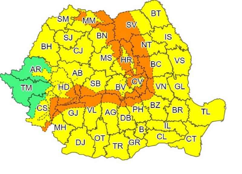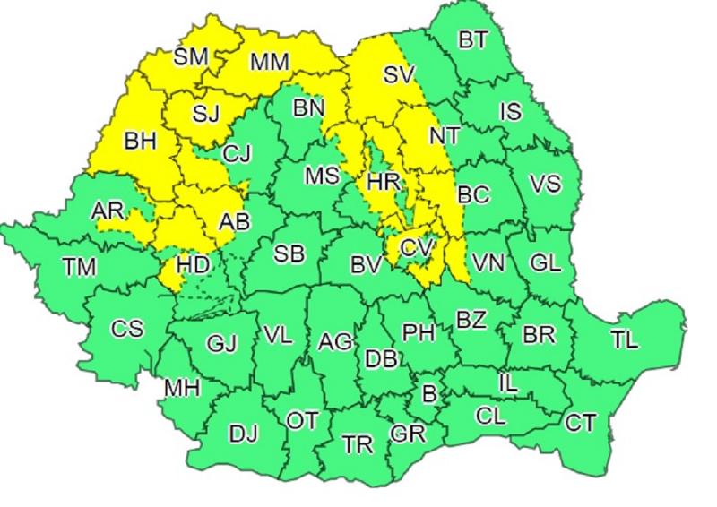 Avertizarea cod galben va fi în vigoare pentru județele Hunedoara, Arad, Alba, Cluj, Bihor, Sălaj, Satu Mare, Maramureș, Bistrița Năsăud, Suceava, Mureș, Neamț, Harghita, Bacău, Brașov, Covasna și Vrancea.