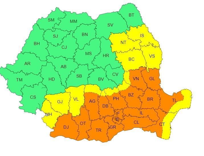 Conform Administraţiei Naţionale de Meteorologie (ANM), în intervalul 11 iunie, ora 10:00 - 12 iunie, ora 10:00, va fi Cod portocaliu de temperaturi deosebit de ridicate, caniculă şi disconfort termic accentuat în 16 judeţe şi Municipiul Bucureşti. Astfel, în cea mai mare parte a Munteniei, sud-estul Olteniei, partea continentală a Dobrogei şi în sudul Moldovei se vor înregistra temperaturi deosebit de ridicate pentru această dată, cu maxime între 35 şi 37 de grade. Indicele temperatură-umezeală (ITU) va depăşi pragul critic de 80 de unităţi.