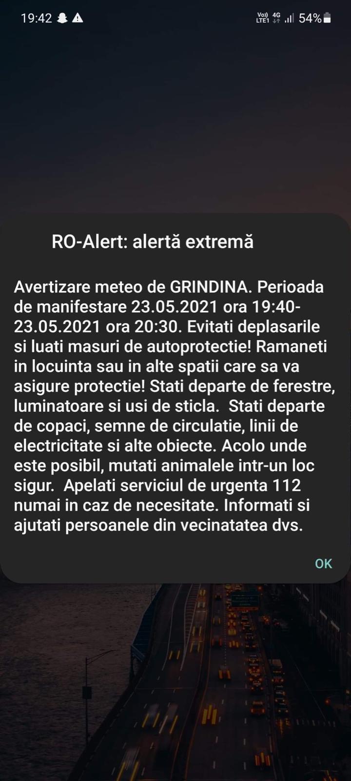 Meteorologii au emis duminică avertizări de Cod portocaliu de furtuni pentru mai multe localități din județul Sălaj și Bihor. Totodată, Inspectoratul pentru Situaţii de Urgenţă a transmis un mesaj prin sistemul RO-ALERT de alertă extremă privind căderea de grindină și le-a cerut oamenilor să se pună cât mai repede la adăpost.