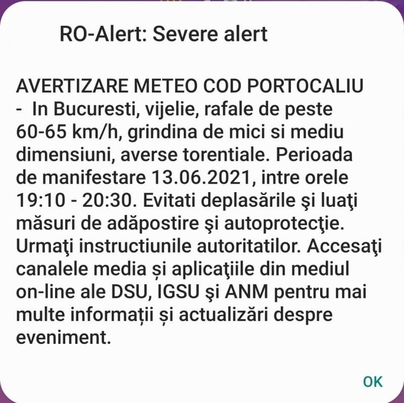 În București a fost emis un cod portocaliu de vijelii, rafale de peste 60...65 km/h, frecvente descărcări electrice, grindină de mici și medii dimensiuni, averse torențiale - cu precădere în jumătatea de vest a orașului.