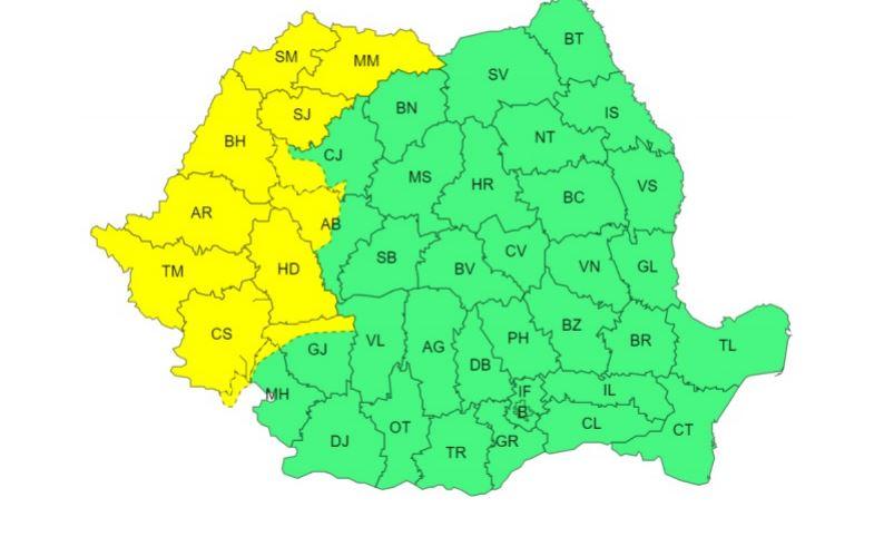 De asemenea, potrivit altei avertizări, de Cod galben, valabilă de sâmbătă seara, până duminică la ora 10.00, în Banat, Crișana, Maramureș, vestul Transilvaniei și local la munte vor fi perioade cu averse, descărcări electrice și intensificări ale vântului, local cu rafale în general de 50...60 km/h. Izolat vor fi vijelii și va cădea grindină. În intervale scurte de timp sau prin acumulare cantitățile de apă vor fi de 20...25 l/mp și izolat de peste 30...40 l/mp.