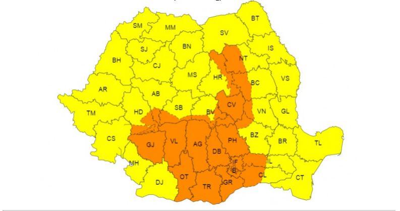 Vremea în România. Meteorologii au emis o atenționare Cod portocaliu de ploi torențiale și abundente valabilă până sâmbătă în nordul și estul Olteniei, cea mai mare parte a Munteniei, Carpații Meridionali și Orientali. Celelalte regiuni vor fi sub avertizare Cod galben de averse, descărcări electrice și vânt. În Capitală, vremea se va răci semnificativ și va deveni instabilă, în următoarele zile. De duminică după-amiază până luni dimineață vor fi averse torențiale și descărcări electrice. În intervale scurte de timp și prin acumulare cantitățile de apă vor fi de 40...60l/mp și posibil de peste 70 l/mp.
