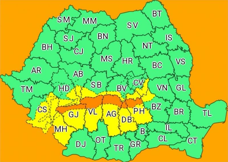 Administraţia Naţională de Meteorologie a emis, luni dimineaţă, o avertizare cod portocaliu de viscol puternic și ninsori abundente la munte. Potrivit ANM, în restul țării va fi cod galben de ploi.
