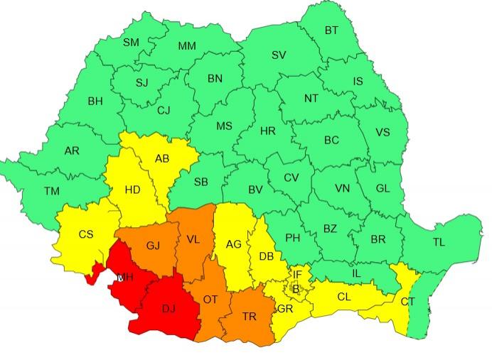 De luni până marți dimineață va fi în vigoare și o avertizare cod portocaliu de caniculă. Canicula și disconfortul termic vor fi accentuate în județele Olt, Teleorman, Gorj și Vâlcea. Temperaturile maxime vor fi de 37...39 de grade. În același interval de timp, în sudul Banatului, sud-vestul Transilvaniei, nord-vestul, sudul și centrul Munteniei, sudul Dobrogei continentale va fi cod galben de caniculă. Tot luni, în intervalul 6.00-18.00 va fi cod galben de intensificări ale vântului în județele Galați, Brăila, vestul județului Ialomița, zona joasă a județelor Vrancea, Buzău și Prahova. Vântul va avea intensificări, cu rafale de 50...70 km/h, a precizat ANM.