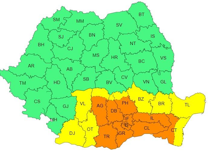 Administraţia Naţională de Meteorologie a actualizat avertizarea de caniculă. Astfel, pentru astăzi, specialiştii au prelungit şi extins codul portocaliu în cea mai mare parte a Munteniei și sud-vestul Dobrogei. De asemenea, în județele Teleorman, Giurgiu, Ilfov și municipiul București valul de căldură va continua şi sâmbătă.