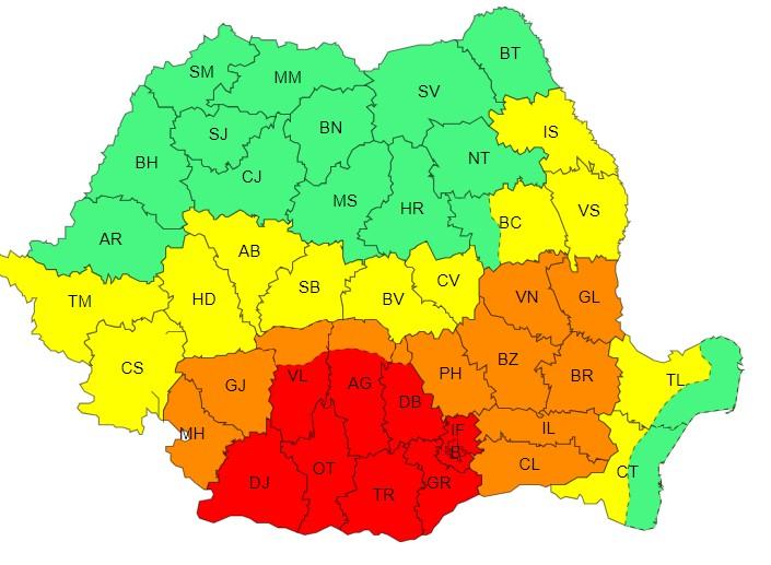 Duminică, în județele Dolj, Olt, Teleorman, Giurgiu, Ilfov, în sudul județelor Vâlcea, Argeș, Dâmbovița, precum și în municipiul București, valul de căldură va fi intens și persistent, iar temperaturile vor fi deosebit de ridicate, pentru a cincea zi consecutiv. În aceste zone va fi Cod roșu. Temperaturile maxime vor fi de 38...39 de grade, iar cele minime, se vor situa în jurul a 20 de grade (nopți tropicale). Va fi caniculă și disconfort termic deosebit de accentuat, iar indicele temperaturăumezeală (ITU) va depăși pragul critic de 80 de unități.