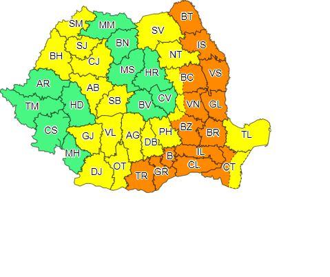 Judeţele ce se vor afla sub codul galben de căldură sunt: Suceava, Neamţ, Bacău (partea de vest), Vrancea (partea de vest), Buzău (parţial), Constanţa (jumătatea de est), Tulcea, Prahova, Dâmboviţa, Argeş, Olt, Dolj, Vâlcea, Gorj, Sibiu, Alba, Cluj, Sălaj, Bihor şi Satu Mare.
