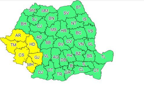 Pe 29 august, între ora 16 şi ora 21 este în vigoare un cod galben: se va înregistra instabilitate atmosferică în Crișana, estul Olteniei, vestul Maramureșului și al Transilvaniei, precum și în Carpații Occidentali și Meridionali. Vremea va deveni treptat instabilă. Vor fi perioade cu intensificări ale vântului (rafale de 55-65 km/h), vijelii, averse torențiale, descărcări electrice și grindină. În intervale scurte de timp sau prin acumulare, cantitățile de apă vor fi de 25-30 l/mp și izolat peste 35 l/mp.