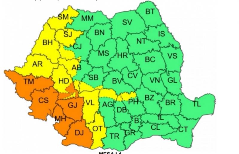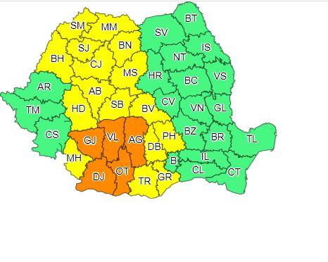 Tot azi, între ora 16 şi 21 este alertă cod portocaliu de instabilitate atmosferică accentuată în Banat, jumătatea de vest a Olteniei și sud-vestul Transilvaniei. Vor fi intensificări ale vântului (rafale în general de 70-80 km/h), pe alocuri vijelii puternice, averse torențiale, descărcări electrice și grindină. În intervale scurte de timp (1-3 ore) sau prin acumulare cantitățile de apă vor fi de 35-40 l/mp și izolat peste 50-60 l/mp.