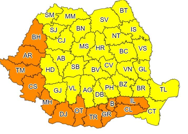 Harta județelor afectate de codurile galben și portocaliu de caniculă