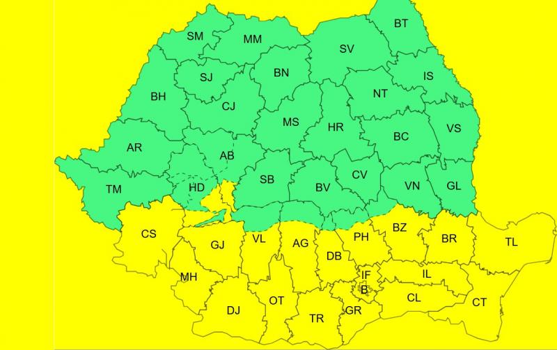 De asemenea, sâmbătă, în intervalul orar 8 - 20, vântul va avea intensificări în Dobrogea, sudul, centrul și estul Munteniei, cu viteze de 50...65 km/h.