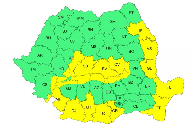 Administraţia Naţională de Meteorologie (ANM) a emis o avertizare Cod galben de vreme severă, valabilă în 23 de judeţe, pe parcursul zilei de sâmbătă.