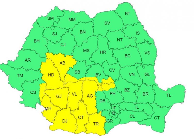 ANM a emis o avertizare cod galben de averse torențiale, descărcări electrice, intensificări ale vântului și izolat grindină în Oltenia, vestul Munteniei, sud-vestul Transilvaniei, precum și în Carpații Meridionali și local în Carpații Occidentali.
