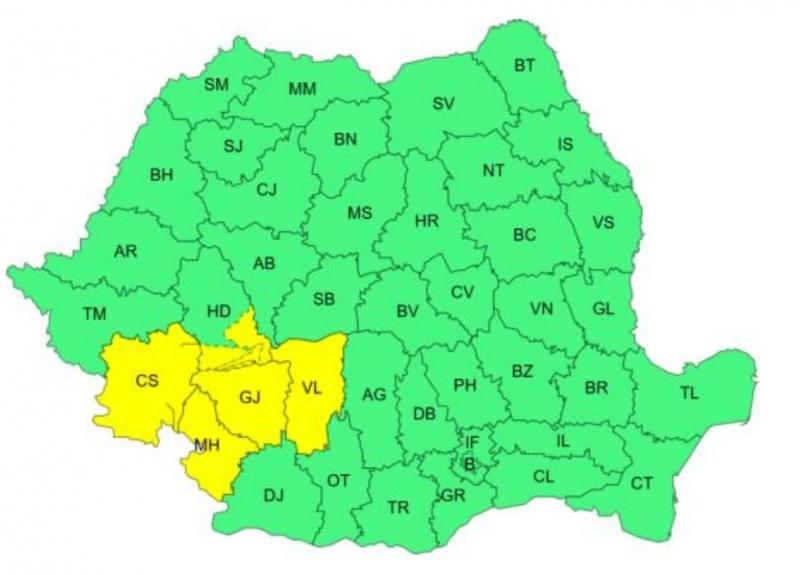Un cod galben de ploi intră în vigoare astăzi, 26 martie, de la ora 12:00, în Caraș-Severin, Gorj , Mehedinți, Vâlcea, Hunedoara și va rămâne valabil până pe 28 martie, ora 12:00.