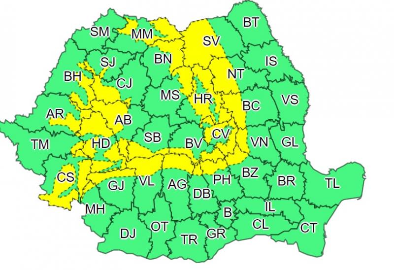Codul galben va fi valabil pentru județele Maramureș, Sălaj, Suceava, Bistrița-Năsăud, Neamț, Harghita, Mureș, Brașov, Covasna, Prahova, Dâmbovița, Argeș, Vâlcea, Mehedinți, Gorj, Sibiu, Alba, Cluj, Bihor, Arad, Timiș, Caraș Severin, Hunedoara, Bacău, Vrancea și Buzău.