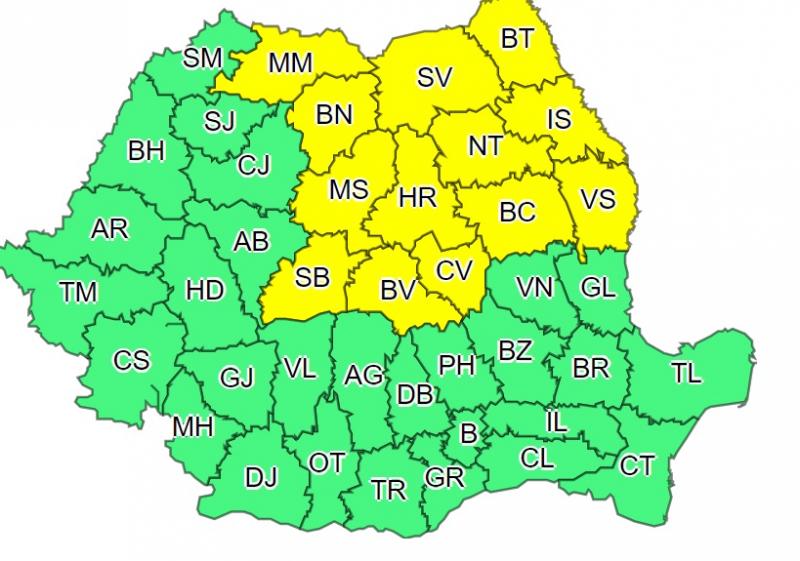Administrația Națională de Meteorologie a emis o avertizare cod galben de ger, valabilă până sâmbătă, în 13 județe. Potrivit specialiștilor, în aceste zone vremea va fi deosebit de rece, cu temperaturi care se vor situa în general între -25 și -18 grade Celsius.