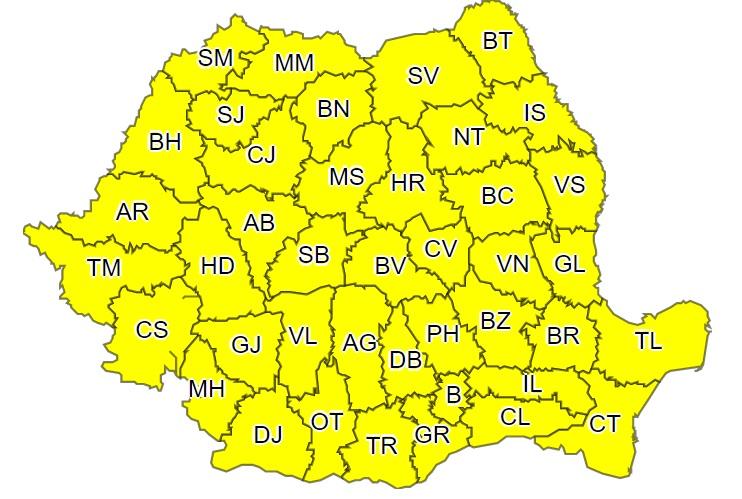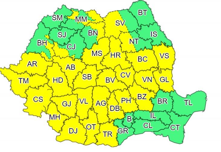 Primul cod galben intră în vigoare vineri ora 12.00 și este valabil până până sâmbătă ora 12.00. În Banat, Oltenia, local în Crișana, Transilvania, Muntenia, în sudul și centrul Moldovei, precum și în zonele de munte vor fi perioade cu averse torențiale, descărcări electrice, intensificări ale vântului și izolat grindină și vijelii. În intervale scurte de timp sau prin acumulare, cantitățile de apă vor depăși 25...30 l/mp și izolat 40...50 l/mp. Avertizarea vizează județele Maramureș, Suceava, Bistrița-Năsăud, Neamț, Harghita, Mureș, Brașov, Covasna, Prahova, Dâmbovița, Argeș, Vâlcea, Dolj, Mehedinți, Sibiu, Alba, Cluj, Bihor, Arad, Timiș, Caraș Severin, Hunedoara, Bacău, Vaslui, Vrancea, Galați, Buzău, Giurgiu și Olt.