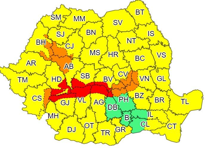 Harta județelor afectate de codurile galben, portocaliu și roșu