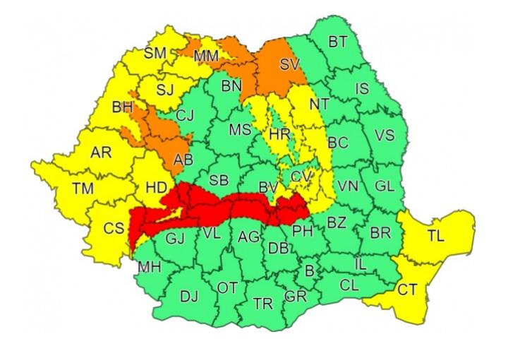 Harta județelor afectate de codurile roșu, galben și portocaliu
