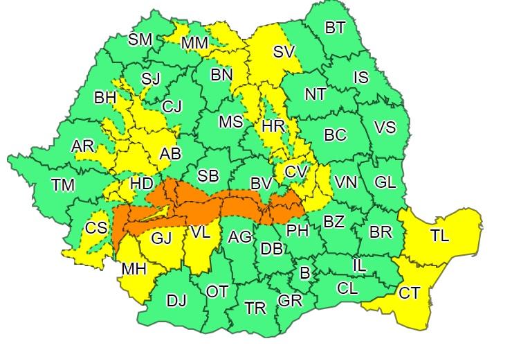 Harta județelor afectate de codurile galben și portocaliu